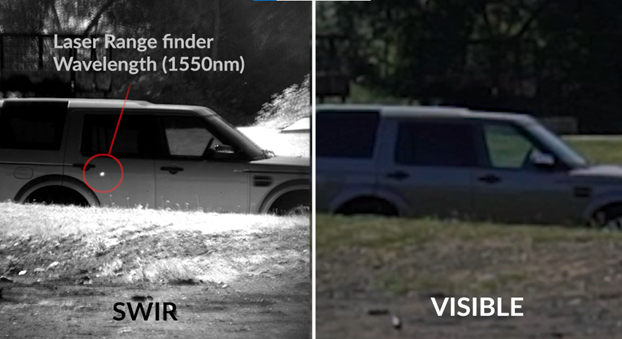 SWIR image depicting laser detection at 1550nm and through smoke compared to visible image which cannot see through or detect the laser.